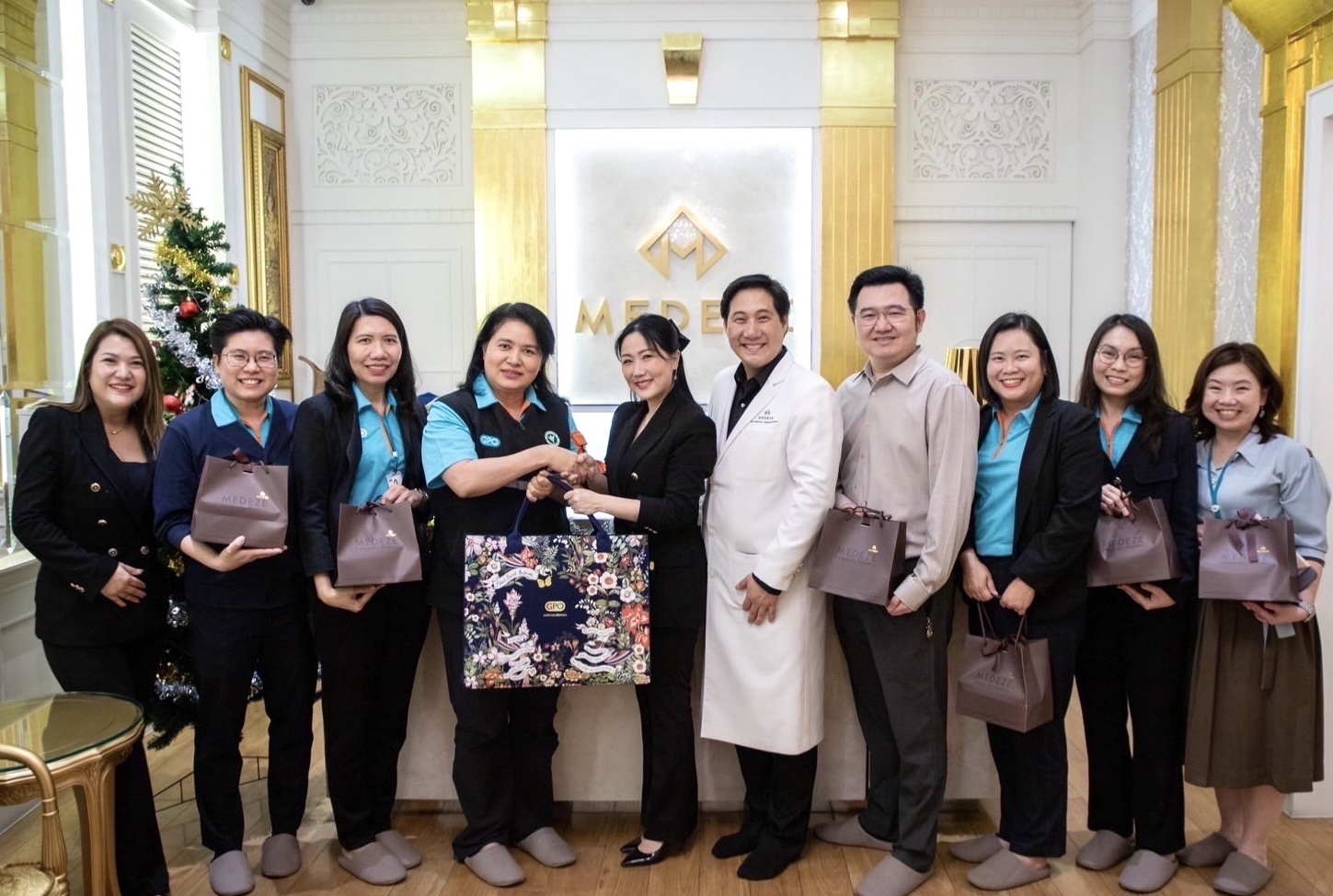 นายแพทย์วีรพล เขมะรังสรรค์ (ที่ 5 จากขวา) ประธานเจ้าหน้าที่บริหาร นางสาวดนิตาพิทักษ์เนติกุล (ที่ 6 จากขวา) ประธานเจ้าหน้าที่สายพัฒนาธุรกิจ บริษัท เมดีซ กรุ๊ป จำกัด(มหาชน) หรือ MEDEZE ผู้ให้บริการตรวจวิเคราะห์ คัดแยก เพาะเลี้ยง และรับฝากเซลล์ต้นกำเนิด หรือ Stem Cells และตรวจศักยภาพเซลล์ภูมิคุ้มกัน หรือ NK Cells รวมถึงการจัดเก็บเชลล์รากผม และระบบจัดเก็บเซลล์ด้วยหุ่นยนต์ ยกระดับสู่ผู้นำไบโอเทค และธนาคารเซลล์ต้นกำเนิดชั้นนำ ร่วมให้การต้อนรับพญ. มิ่งขวัญ สุพรรณพงศ์ (ที่ 4 จากซ้าย)ผู้อำนวยการองค์การเภสัชกรรม ดร.ภก.จตุพล เจริญกิจไพบูลย์(ที่ 4 จากขวา) ผู้ช่วยผู้อำนวยการ พร้อมคณะ ในโอกาสเข้าเยี่ยมชมกิจการและรับฟังข้อมูลธุรกิจ และได้เยี่ยมชมแล็บที่ได้รับรองมาตราฐาน ณ บริษัท เมดีซ กรุ๊ป จำกัด (มหาชน) สำนักงานใหญ่ พุทธมณฑลสาย 4