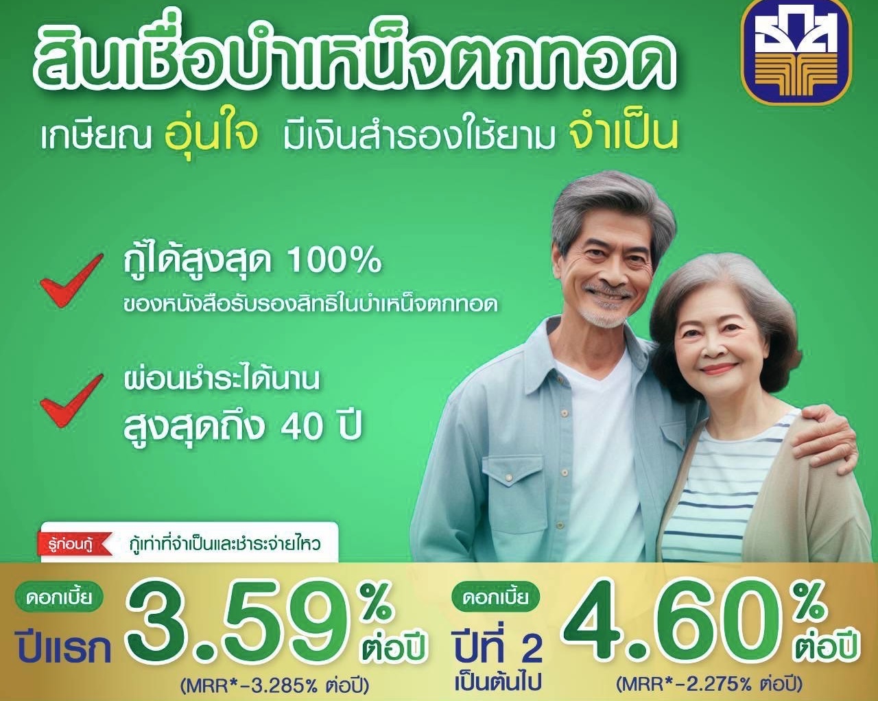ธ.ก.ส. เสิร์ฟสินเชื่อบำเหน็จตกทอด สำหรับผู้เกษียณอายุที่ได้รับเงินบำนาญและบำเหน็จรายเดือน นำไปใช้เป็นค่าใช้จ่ายหมุนเวียนในชีวิตประจำวันและค่าใช้จ่ายอื่น ๆ ที่จำเป็น รวมถึงการลดปัญหาการพึ่งพาหนี้นอกระบบที่มีอัตราดอกเบี้ยไม่เป็นธรรม เพื่อคุณภาพชีวิตที่ดี วงเงินกู้ต่อรายสูงสุด 100% ของหนังสือรับรองสิทธิในบำเหน็จตกทอด อัตราดอกเบี้ยปีแรก MRR ลบ3.285% ต่อปี ปัจจุบันเท่ากับ 3.59% เท่านั้น และปีที่ 2